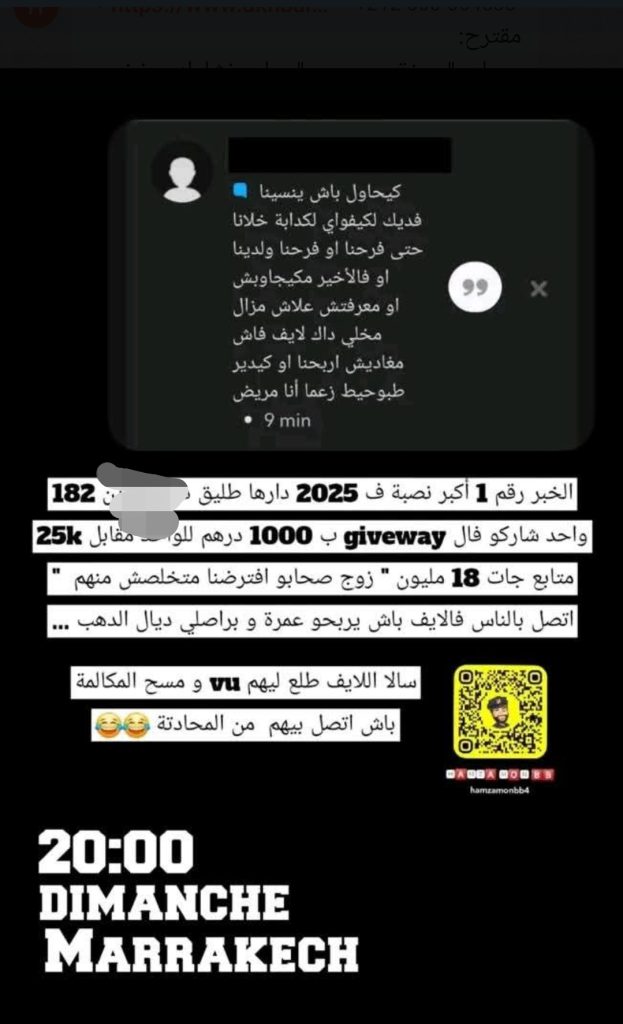 Selon les informations partagées, le concours offrait une omra gratuite et un bracelet en or, moyennant une participation de 1000 dirhams par personne. Pas moins de 182 personnes auraient participé, générant plus de 180 000 dirhams.